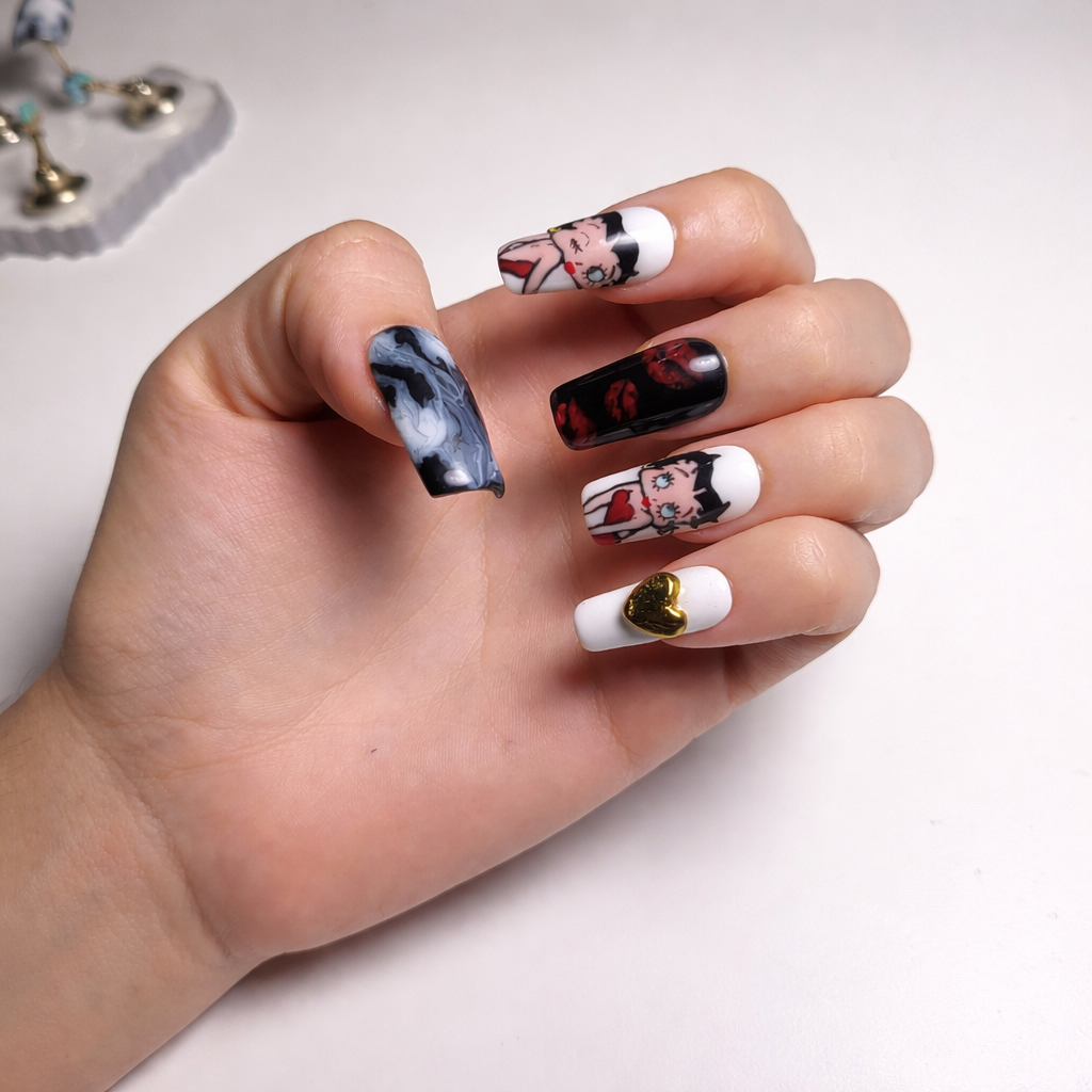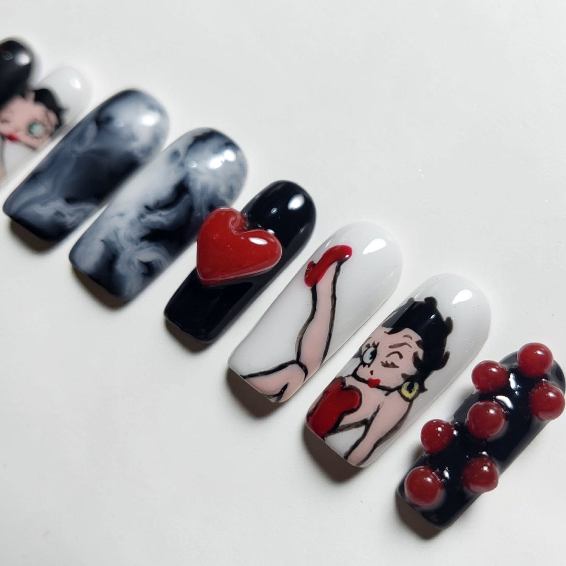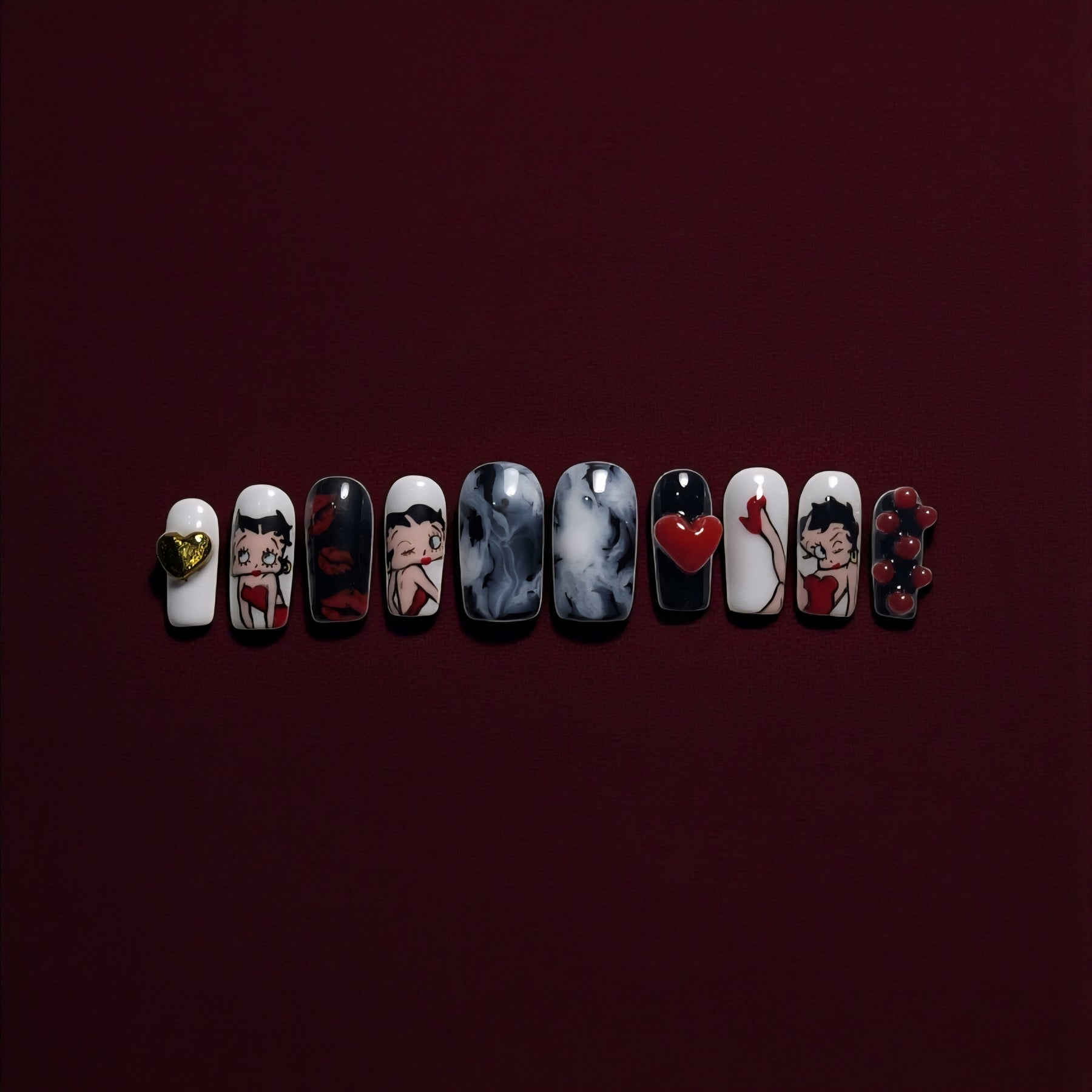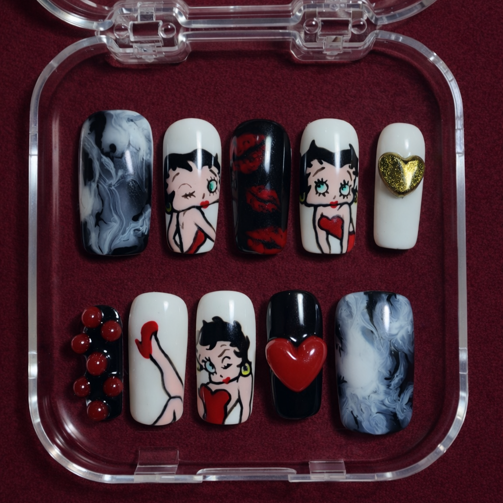 Este set rinde homenaje a Betty Boop fusionando el arte de personaje con un efecto marble (mármol) en blanco y negro de alta profundidad. Los detalles en rojo intenso, los accesorios de corazones en relieve y el acabado impecable hacen de este diseño una declaración de estilo y lujo artístico.