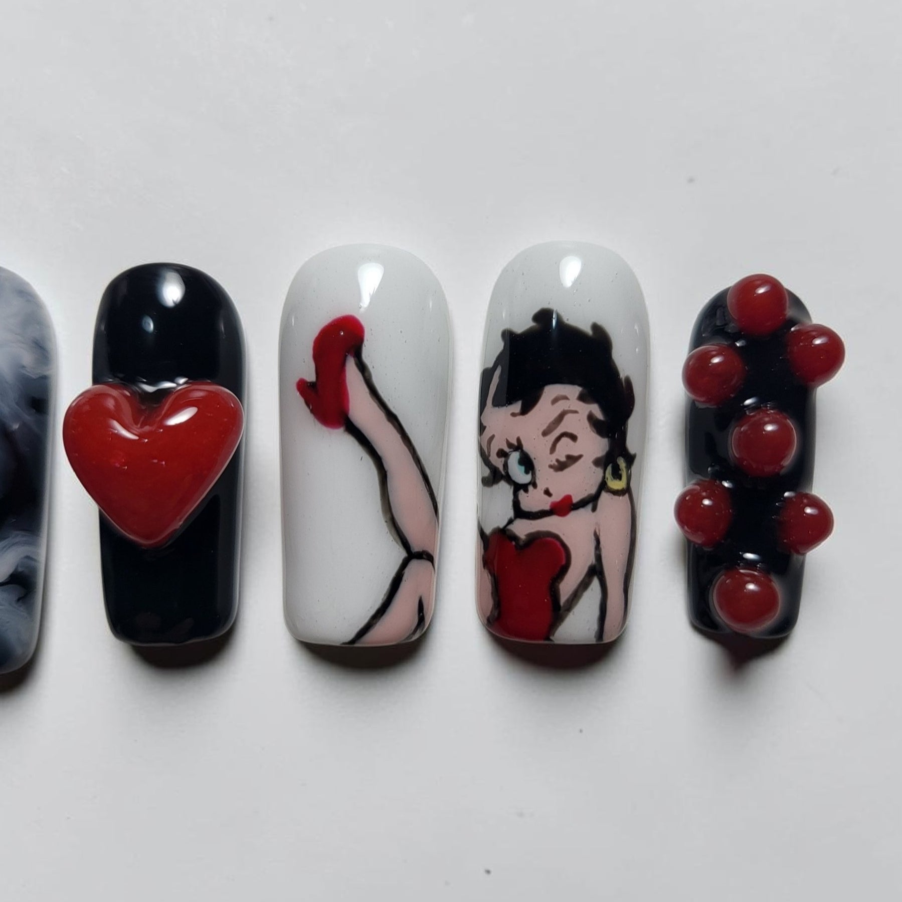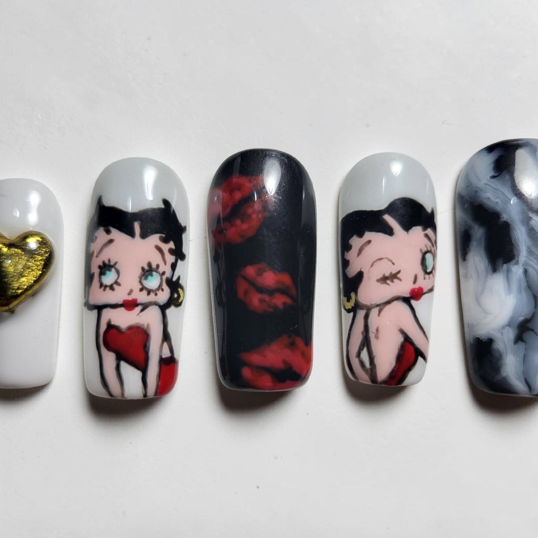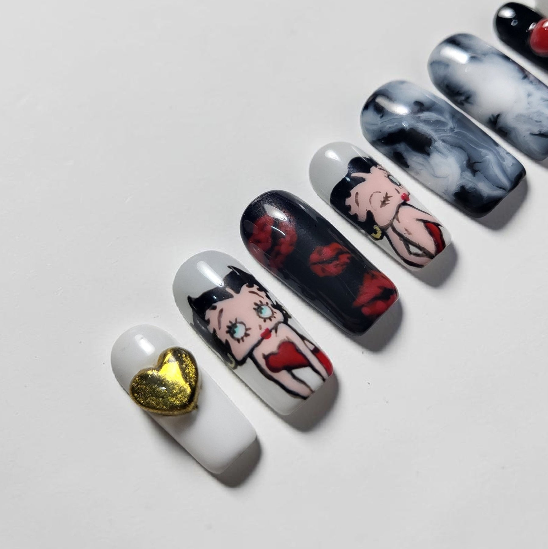 Este set rinde homenaje a Betty Boop fusionando el arte de personaje con un efecto marble (mármol) en blanco y negro de alta profundidad. Los detalles en rojo intenso, los accesorios de corazones en relieve y el acabado impecable hacen de este diseño una declaración de estilo y lujo artístico.